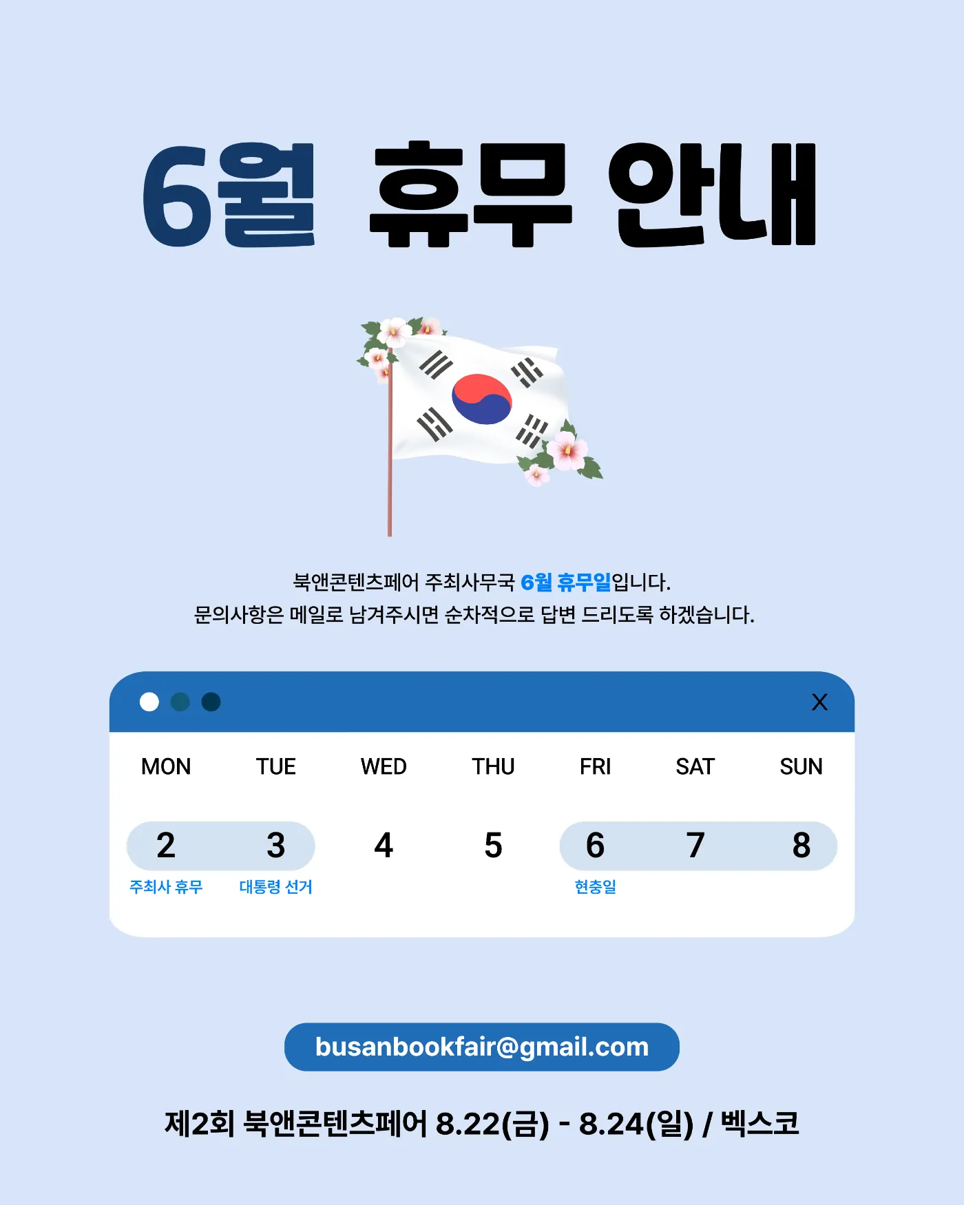 6월 2일(월) - 6월 3일(화),6월 6일(금)은 주최사무국의 휴무입니다.