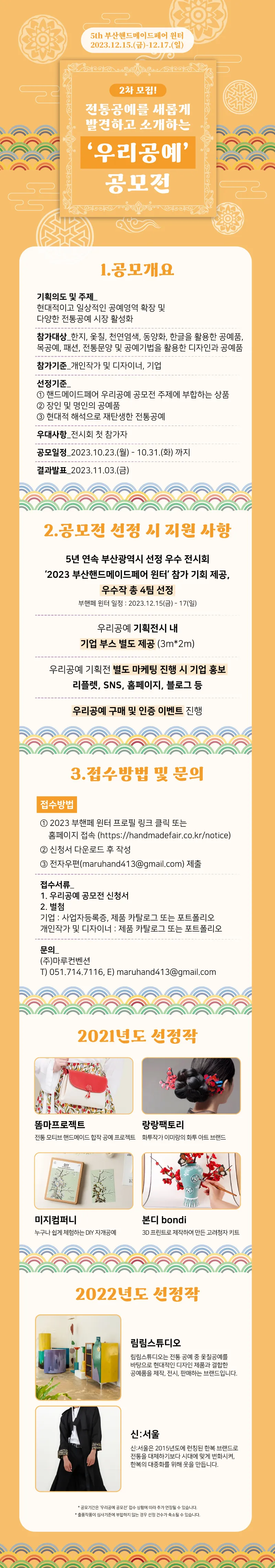 * 신청방법 : 첨부파일 '2023 부산핸드메이드페어 우리공예 공모전_참가서류' 파일 다운로드 후 작성하여 maruhand413@gmail.com 전자우편 제출