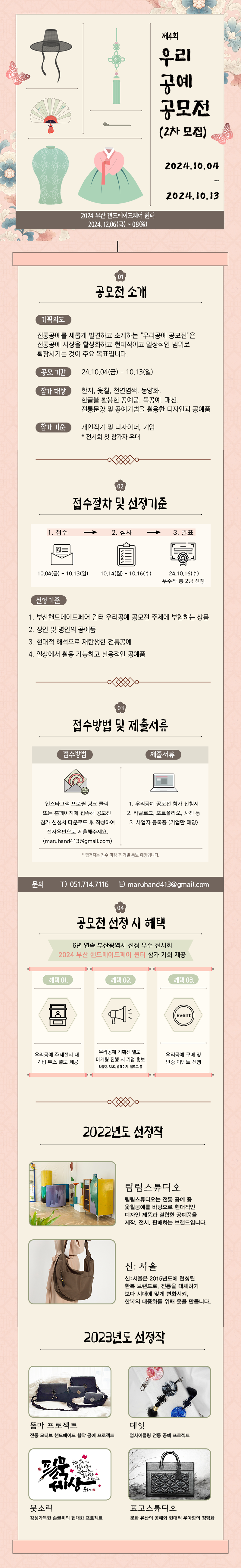 * 신청방법 : 첨부파일 '2024 부산핸드메이드페어 우리공예 공모전_참가서류' 파일 다운로드 후 작성하여 maruhand413@gmail.com 전자우편 제출