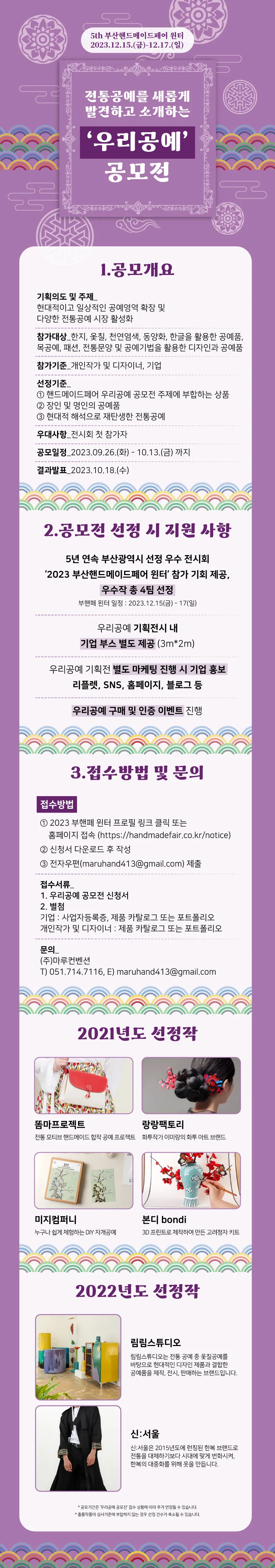 * 신청방법 : 첨부파일 '2023 부산핸드메이드페어 우리공예 공모전_참가서류' 파일 다운로드 후 작성하여 maruhand413@gmail.com 전자우편 제출